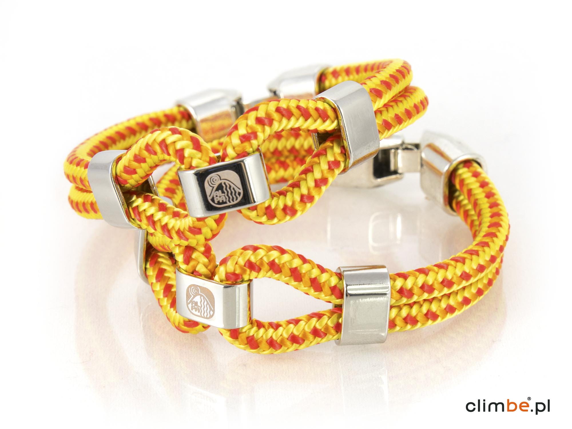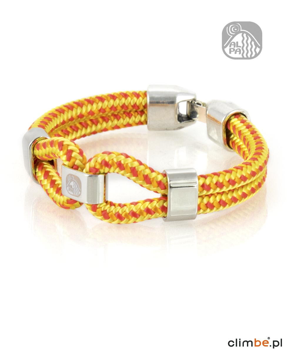 Bransoletka wspinaczkowa climbe Allpa Mayo wykonana z pomocniczej liny wspinaczkowej o średnicy 5 mm, podwójnie złożonej, z metalowymi przekładkami. W punkcie centralnym bransoletki znajduje się grawer w kształcie peruwiańskiej góry Alpamayo (5947 m.), która przez wielu ludzi uważana jest za najpiękniejszą gorę świata.