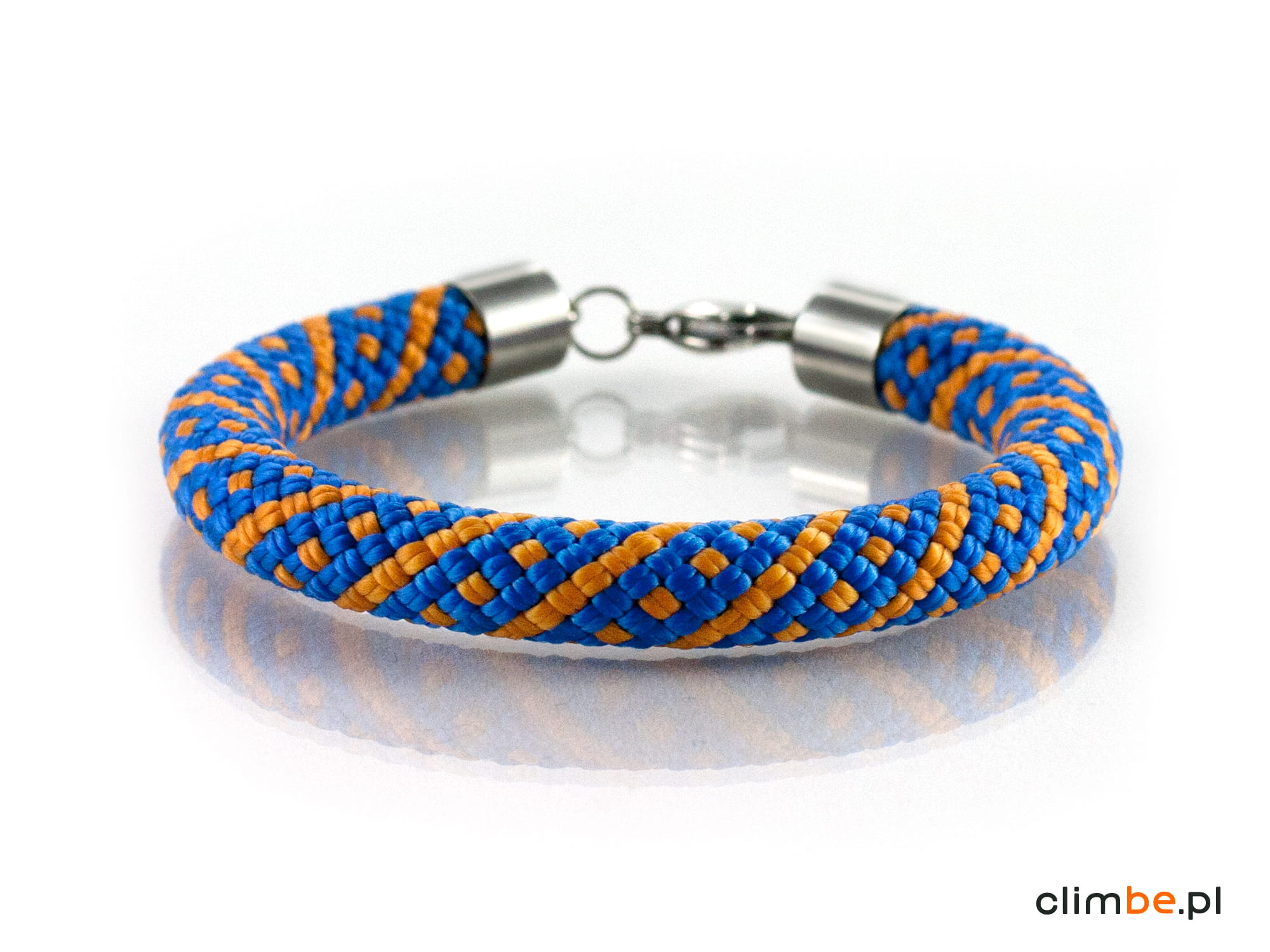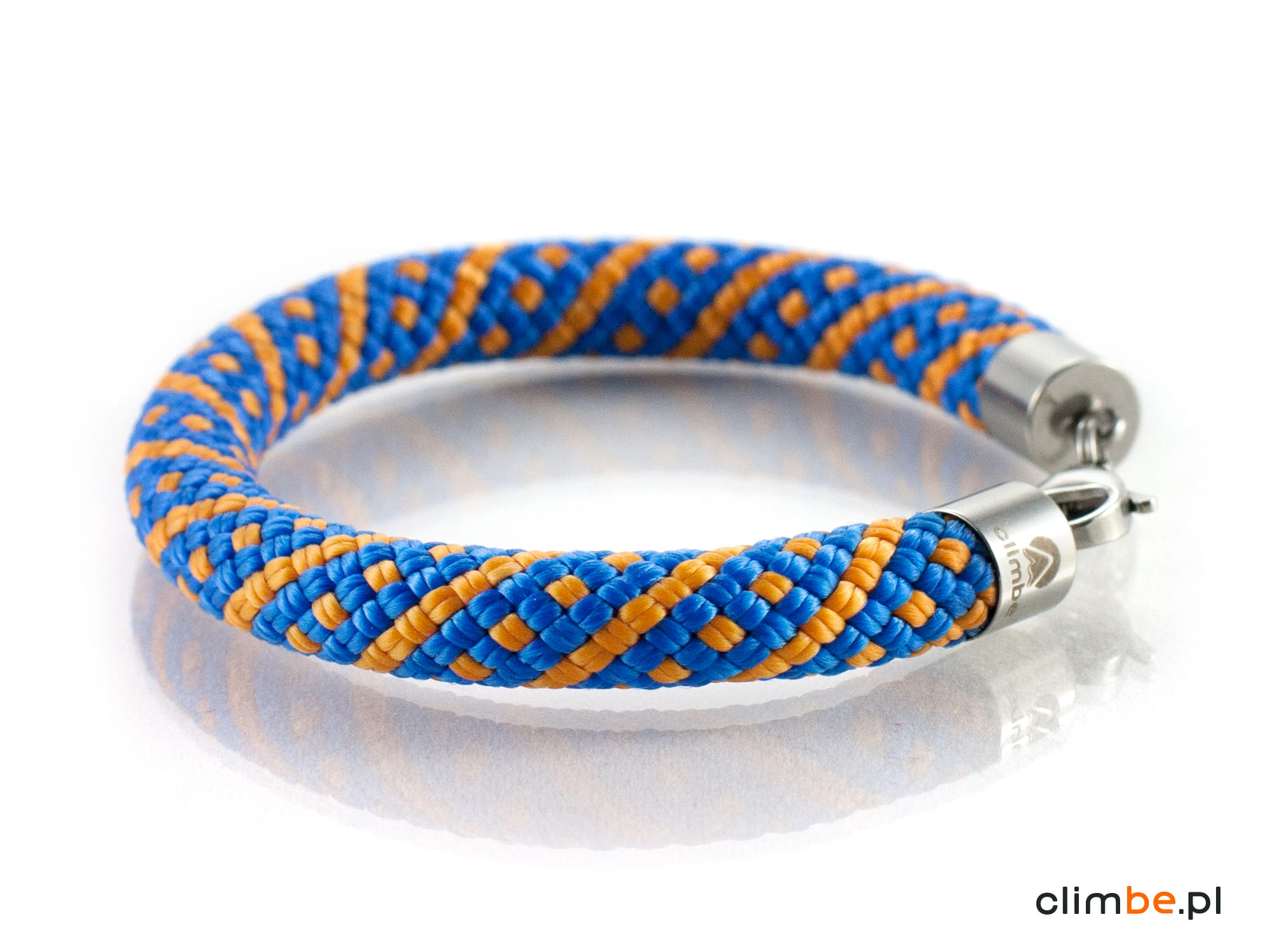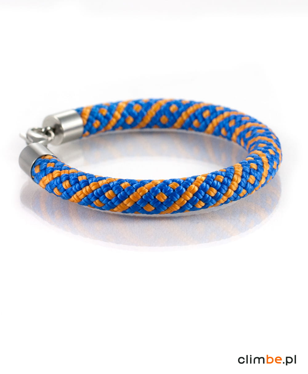 Bransoletka wspinaczkowa Orange Mountain Trail wykonana z niezwykle pięknej liny wspinaczkowej w kolorze niebieskim z pomarańczowymi wzorami. Kolorystyka bransoletki nawiązuje do górskich grani, skąpanych w letnim słońcu, na tle błękitu nieba. Bransoletka wykonana została z 8 mm liny wspinaczkowej. Zapięcie na karabińczyk wykonane zostało z wysokiej jakości stali nierdzewnej, nazywanej również stalą chirurgiczną, o właściwościach antyalergicznych.