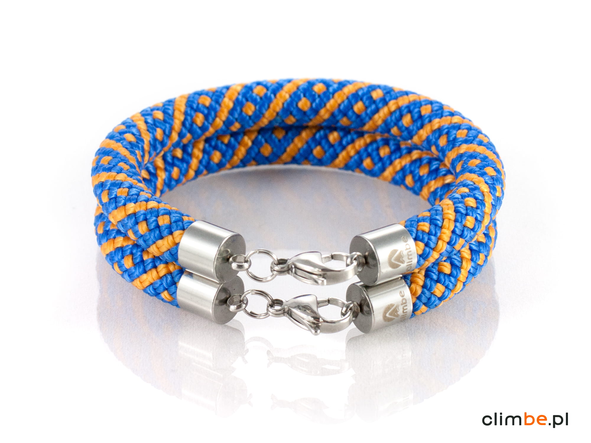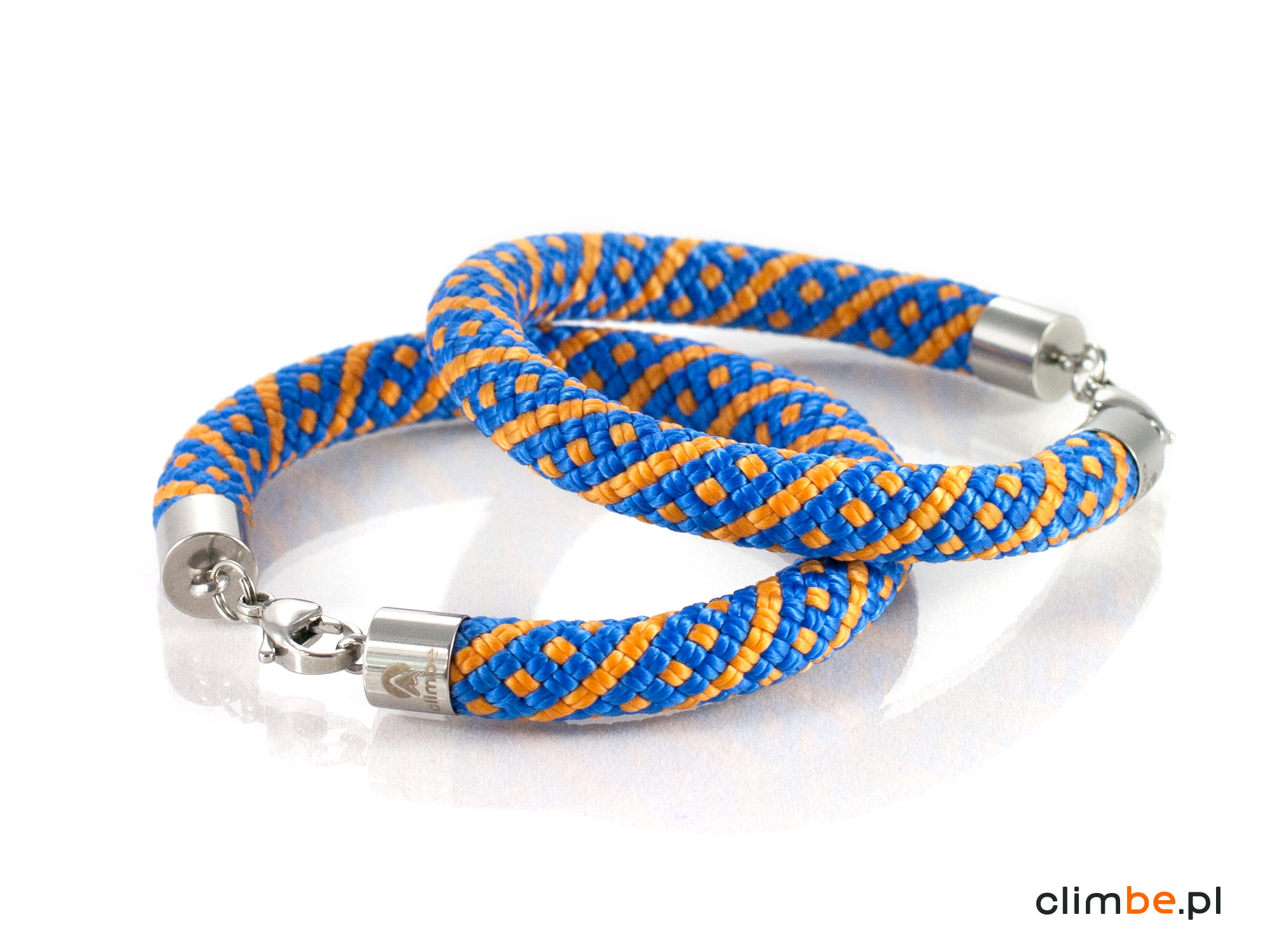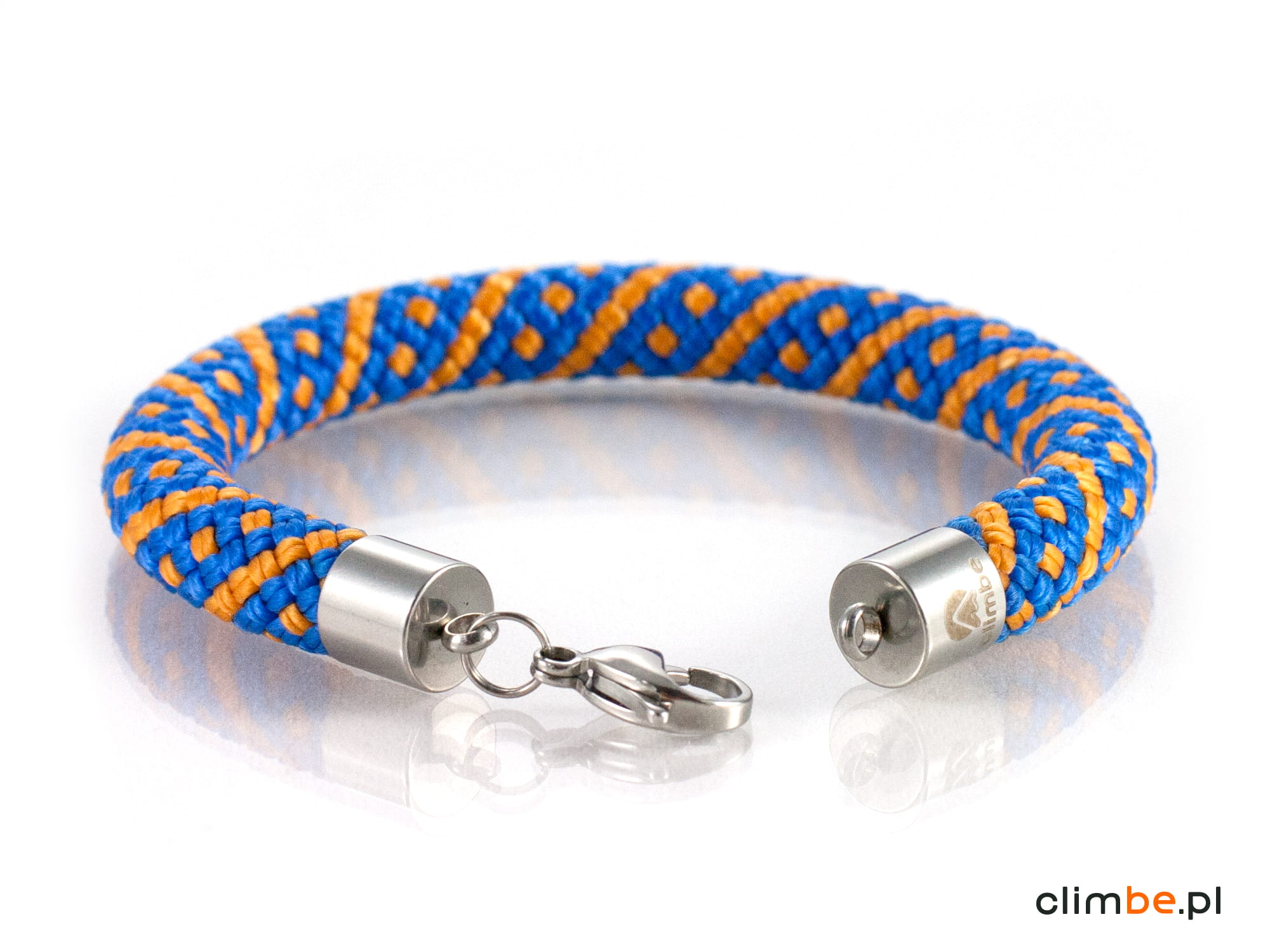 Bransoletka wspinaczkowa Orange Mountain Trail wykonana z niezwykle pięknej liny wspinaczkowej w kolorze niebieskim z pomarańczowymi wzorami. Kolorystyka bransoletki nawiązuje do górskich grani, skąpanych w letnim słońcu, na tle błękitu nieba. Bransoletka wykonana została z 8 mm liny wspinaczkowej. Zapięcie na karabińczyk wykonane zostało z wysokiej jakości stali nierdzewnej, nazywanej również stalą chirurgiczną, o właściwościach antyalergicznych.