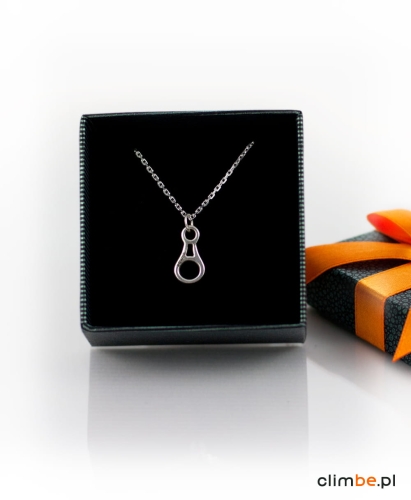 Stylowa i niezwykle oryginalna srebrna zawieszka Climbe w kształcie ósemki, przyrządu zjazdowego. Wykonana ręcznie ze srebra o próbie 925. W zestawie srebrny łańcuszek i estetyczne pudełko do przechowywania. Na ósemce wygrawerowany napis Climbe. Seria Handmade. Produkt Polski.